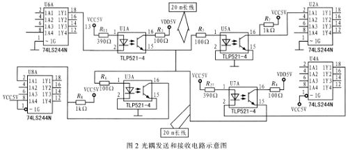采用光電隔離器TLP521-4對(duì)發(fā)送和接收設(shè)備進(jìn)行電氣隔離,對(duì)于減小交流阻抗的作用十分明顯,進(jìn)而增大傳輸電流,有效地抑制地線噪聲;同時(shí)由于74LS244N的應(yīng)用。總線驅(qū)動(dòng)能力得到保障。圖2為光耦發(fā)送和接收電路示意圖。圖2中,上半部兩光耦自左向右傳輸信號(hào),下半部兩光耦自右向左傳輸信號(hào),左端74LS244N通過靜態(tài)存儲(chǔ)器IDT7132與處理器進(jìn)行數(shù)據(jù)交換,右端通過8255與處理器進(jìn)行數(shù)據(jù)交換。