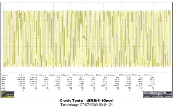 JEDEC標(biāo)準(zhǔn)要求測(cè)量n分別為2、3、4、5、6-10、11-15時(shí)tERR(n per)的最大及最小值。對(duì)于這樣的要求,如果要用手工測(cè)量將是非常耗時(shí)且低效率的。力科QPHY-DDR2軟件包的時(shí)鐘測(cè)量部分支持上述所有參數(shù)的自動(dòng)測(cè)量,僅需使用一根差分探頭將時(shí)鐘信號(hào)接入示波器即可完成所有的測(cè)量工作,測(cè)量后的所有參數(shù)結(jié)果及對(duì)應(yīng)波形將列在自動(dòng)生成的測(cè)試報(bào)告中并與JEDEC標(biāo)準(zhǔn)中門限值進(jìn)行比較。如下圖為使用QPHY-DDR2測(cè)量tERR(6-10 per)時(shí)的部分結(jié)果與對(duì)應(yīng)波形。