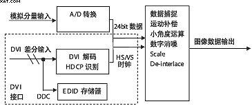 由原理圖看,數(shù)字電視增加DVI接口比較簡單,從硬件電路考慮,一是在接口處增加DVI解碼部分,二是在后端提供一個數(shù)據(jù)通道,如果電視原有方案中具有A/D轉(zhuǎn)換和相應(yīng)的后級數(shù)據(jù)處理通道,那么DVI接口解碼輸出的數(shù)據(jù)可以與它共用,因?yàn)樵跀?shù)字信號格式一定的情況下,其碼率、行頻、場頻、時鐘是一致的。