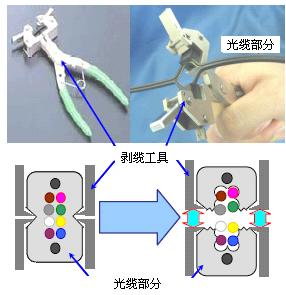 這種纜采用PVC緊套光纖,金屬吊線,PVC或LSZH做阻燃護(hù)套層,適合于室內(nèi)布線使用,性能穩(wěn)定可靠;采用小彎曲半徑光纖生產(chǎn),具有優(yōu)良的抗彎性能;阻燃;施工方便可靠。可以選用專門的工具進(jìn)行剝纜,從光纜“V”形槽區(qū)域剝開,獲得緊套光纖,操作簡(jiǎn)單。如圖3所示。