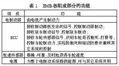 EMB主要用于小型車輛中,主要包含電制動器、ECU、輪速傳感器、動力電源等。它與EHB最大區(qū)別是制動力為電機(jī)提供的轉(zhuǎn)矩,而不是由柱塞泵產(chǎn)生的高壓油,且有獨(dú)立的電源來供電,其各部分的功能如表1。