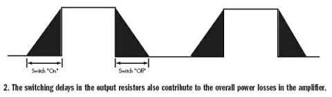 有兩個晶體管“開”的典型的D類放大器的直流等效電路只是一連串的串聯電阻:RON,每個晶體管的輸出傳導損耗;RP,金屬互連線,引線結構和PC板走線的附加電阻;PL,負載電阻(圖1)。另一個產生功耗的是輸出電阻中的開關延遲(圖2)。整個系統的效率使可以估算如下: