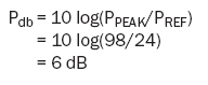 當D類放大器的工作電壓為14V時,可出現98W的峰值。轉換為分貝是: