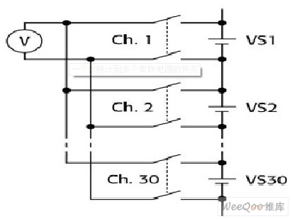 圖1給出了切換伏特計到多個串聯的30電壓源(VS)的情形。為了避免其中一個或多個發生短路,必須在關閉一個通道之前打開另一個通道(操作前斷開)。此外,要給每個電壓源串聯熔絲,避免超過卡的共模額定電壓。在這個例子中,每個電源都是12V,整個串聯電源的總電壓為360V。最好采用至少500V的通道-通道額定電壓和共模額定電壓。