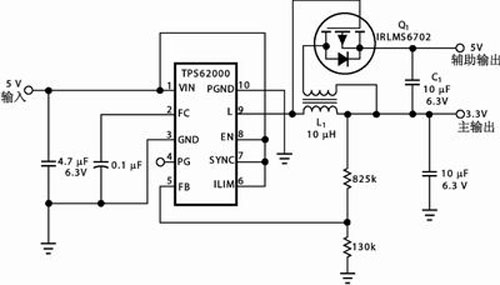 圖2是一種設計頗為緊湊的雙電壓輸出電路,工作頻率750kHz,變換效率可達95%。其中,3.3V主電源由降壓型單片同步開關電源TPS62000構成;該器件具有軟啟動功能,能夠有效抑制輸入浪涌電流與輸出電壓過沖,最大輸出電流600mA。TPS62000的輸出端“L”為低電平時,外接P溝道場效應管Q1隨之導通而令儲能電感L1副繞組的感應電壓向輸出電容C1充電,C1之端電壓同3.3V主輸出疊加即為輔助輸出電壓,其數值取決于L1主、副繞組的匝數比;輔助輸出若為5V,匝數比可取2:1。