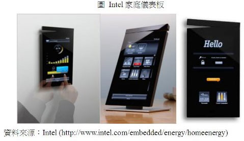 如同前述的家庭能源管理項目,Intel儀表板透過ZigBee無線技術連結家中的各項家電,監控用電狀況。此外,透過WiFi連結家中寬頻網路,可與當地的電力公司進行資訊傳遞或更新(或透過Zigbee技術與智慧電表連結,進一步與電力公司連線)。而透過儀表板上顯示的差異電價時段或市面上各項家電的耗能(節費)資訊,儀表板可以提供使用者用電與家電購置的建議,甚至可協助計算需使用多久的時間才能回本。