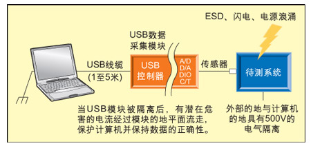 圖2:未隔離的USB數據采集模塊在ESD、閃電、電源浪涌的時候可能損害系統并導致數據不正確。