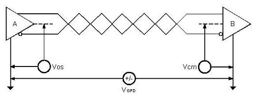 如圖1所示,當(dāng)發(fā)送器A向接收器B發(fā)送數(shù)據(jù)時(shí),發(fā)送器A的輸出共模電壓為VOS,由于兩個(gè)系統(tǒng)具有各自獨(dú)立的接地系統(tǒng)存在著地電位差VGPD,那么接收器輸入端的共模電壓就會(huì)達(dá)到VCM=VOS+VGPD。RS-485標(biāo)準(zhǔn)規(guī)定VOS≤3V,但VGPD可能會(huì)有很大幅度(十幾伏甚至數(shù)十伏),并可能伴有強(qiáng)干擾信號(hào)致使接收器共模輸入VCM超出正常圍,在信號(hào)線上產(chǎn)生干擾電流輕則影響正常通信,重則損壞設(shè)備。