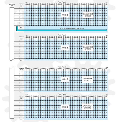 主子板卡決定了Y軸的尺寸,而其他子板卡只是擴(kuò)展了X軸上的點(diǎn)數(shù)。每個子板卡在Y軸尺寸上必須和主子板卡相同,根據(jù)不同版本的BRIC選擇其他不同的子板卡。BRIC在Y軸尺寸上有4,8,16這幾種標(biāo)準(zhǔn)尺寸,要想獲得其他的尺寸就需要減少板卡上的繼電器數(shù)量即可。除了一個柱上開關(guān)外,可以提供的還有屏蔽的和2個柱上開關(guān)的矩陣形式。