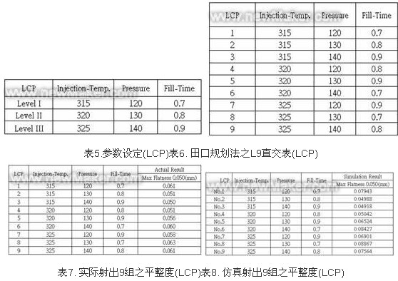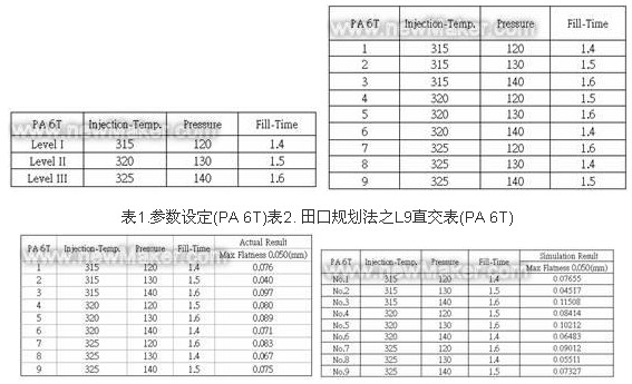 [page]塑料射料LCP在已設定射出溫度、射出壓力、充填時間之條件參數后,再設定仿真之各參數,如表5所示。透過田口方法實驗規劃,可得L9直交表,如表6所 示。依據L9直交表,可清楚得知有9組田口規劃之實驗參數,再分別針對這9組參數,實際作射出成形,并量測實際翹曲度,量測之結果,大部份數據皆不符合塑 料翹曲度(Flatness) 0.05mm規格內,如表7所示。仿真之最佳化參數為第三組,其參數為射出溫度315℃、射出壓力 140 MPa 、充填時間0.9 s,如圖3所示。