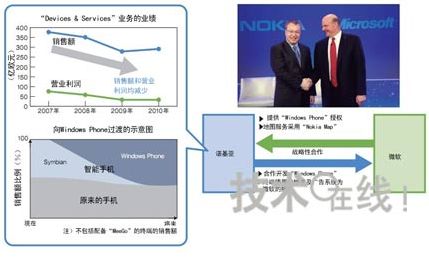 在移動(dòng)產(chǎn)品的全球最大規(guī)模展會(huì)“Mobile World Congress 2011”(2011年2月14~17日)開幕前的2月11日,諾基亞宣布了“歷史性”戰(zhàn)略轉(zhuǎn)換方針。該公司將與美國(guó)微軟進(jìn)行戰(zhàn)略合作,合作內(nèi)容包括采用“Windows Phone”作為智能手機(jī)的主要平臺(tái)等(圖1)。