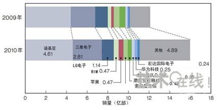 2010年的手機(jī)全球銷量比上年增加31.8%,約為16億部。RIM、蘋果、ZTE、HTC以及華為的銷量順利增長(zhǎng),但LG、索尼愛立信和摩托羅拉移動(dòng)等的銷量則出現(xiàn)減少。(圖:Gartner,2011年2月發(fā)行)