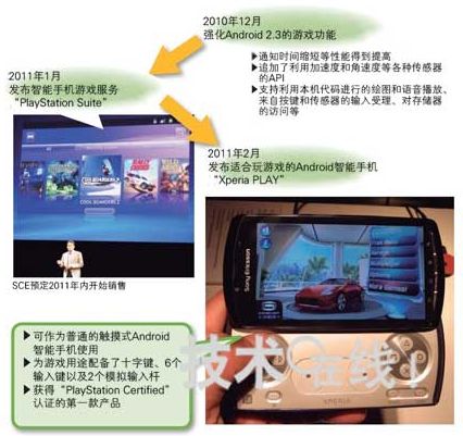 索尼愛立信發(fā)布了獲得SCE“PlayStation Certified”認(rèn)證的首款智能手機(jī)“Xperia PLAY”。索尼愛立信還為強(qiáng)化Android 2.3的游戲功能做出了貢獻(xiàn)。2011年3月上市。