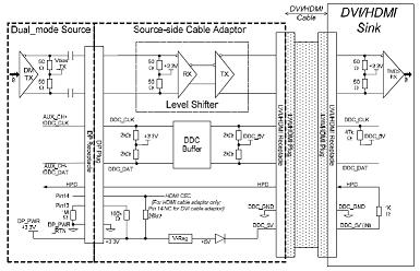說明2:在接口14管腳上的26kΩ上拉電阻只是針對HDMI信號的適配器才需要的。對于DVI信號適配器,接口14管腳需要懸空。支持HDMI模式的雙模源端設備在14管腳上設置有超過5MΩ的下拉電阻,用于識別適配器中的上拉電阻。需要說明的是,作為CEC協議的一部分,HDMI設備可能會將14管腳電壓拉低。