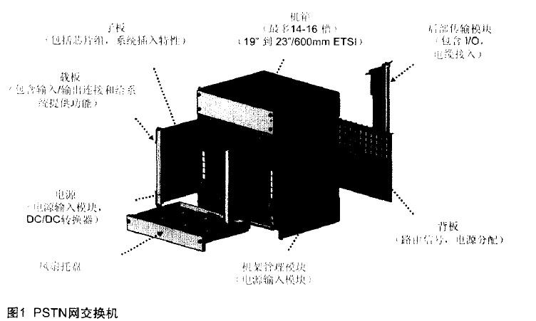 圖1所示為一個PSTN網(wǎng)的交換機(jī),該交換機(jī)由7個部分組成。除了機(jī)箱尺寸的區(qū)別,機(jī)箱底部是一個機(jī)架的管理模塊,它包括管理模塊、傳輸背板和傳輸模塊。最前面有子板、載板、電源板,以及風(fēng)冷系統(tǒng)、電扇托板。在交換機(jī)中,它的主要載板就是電話信息的傳輸以及輸入/輸出的連接,輸入,輸出系統(tǒng)所組成的只有很少的電腦板以及信令控制板。