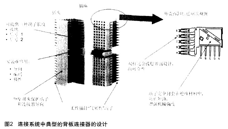 圖2是典型的連接系統(tǒng)中背板連接器的設(shè)計(jì)。它可以提供三種端子長度,即接地端子、信號1端子、信號2端子三個端子的長度是不同的。這是為了保證插座和插針在互相連接的時候,如果接反了,就無法插入。第二個是中問部分,它是用于安裝維修用的,整個插針板在插入的過程中,可以用來導(dǎo)向,甚至可以保證編碼和極性的正確。外壁用來保護(hù)端子和連接器的導(dǎo)向,這個端子就是插針部分,采用柔性插針。從右半部分圖中可以看到,外殼被拆除后,更清楚地顯示出了接觸面。它采用了雙柱冗余的接觸面設(shè)計(jì),這樣可以大大提高接觸的可靠性。