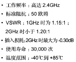 移動手機(jī)用的開關(guān)式同軸連接器主要用于提供手機(jī)內(nèi)的天線和汽車外部天線之間的信號的切換。這種開關(guān)式的連接器,它的表面安裝有三種高度,分別是3.5mm、4.5mm和6.0 mm。表面安裝開關(guān)式連接器直接和手機(jī)天線連接。由于功率元件和天線或開關(guān)間距離短,因此內(nèi)部沒有電纜,信號傳輸非常好。它的性能指標(biāo)如下:
