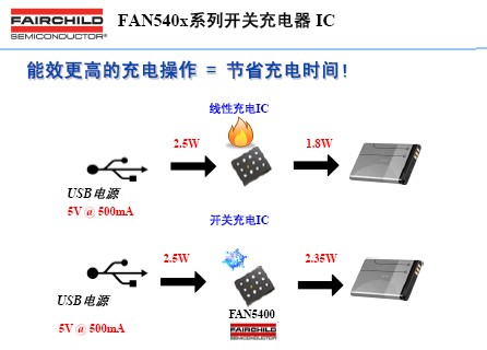 FAN5400系列電池充電器IC使用高集成度開(kāi)關(guān)模式充電器,以便最大限度地縮短從USB電源為單節(jié)鋰離子(Li-Ion)電池充電的時(shí)間,并使用升壓調(diào)節(jié)器從電池為USB外設(shè)供電。由于充電電流和電池容量繼續(xù)增加,使用線性充電器通過(guò)USB端口或5V AC/DC適配器進(jìn)行充電的效率變得越來(lái)越低,F(xiàn)AN5400的開(kāi)關(guān)模式充電器能夠提供高達(dá)94%的效率,有助于加快充電速度并減少熱耗散。
