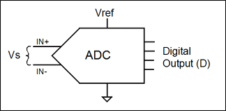 用于將傳感器信號數字化的ADC也是比例器件。無論其內部架構如何,所有ADC都是通過對未知輸入電壓與已知參考電壓相比較來工作的。轉換器的數字化輸出是輸入電壓與參考電壓的比值乘以ADC的滿量程讀數。考慮到內部放大和設計的多樣性,還需要一個比例因子K。無論K值大小,只要ADC的配置未改變,K值都保持固定不變。公式4描述了一個普遍意義上的ADC (圖2)的數字讀數(D)和輸入信號(Vs),參考電壓(Vref),滿量程讀數(FS)以及比例因子(K)間的關系。