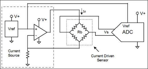 圖4. 該設計中電流驅動傳感器的電流源由一個電阻,一個運算放大器和一個電壓基準組成。