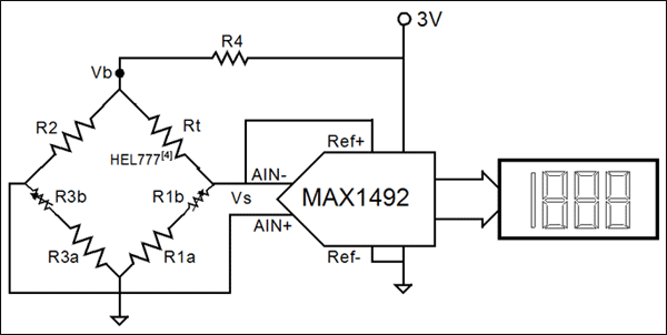 根據公式19,R4的值不會影響讀數。電路中增加R4可以降低RTD的自身熱量。同時也減弱了來自電橋的信號,并且降低了參考電壓。雖然MAX1492無內部PGA,但是它允許使用較小的參考電壓。使用較小的參考電壓可以省去額外的放大電路。