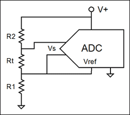 與之相似的采用電流驅動傳感器和單元件阻性傳感器(如RTD)的技術已不常用了。這些電路中ADC的靈敏度會隨溫度或電源電壓的變化而變化。雖然如此,ADC和傳感器輸入的組合還是相當穩定的。