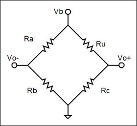 圖9是一個由同一電壓源供電的兩個分壓器組成的惠斯通電橋。習慣將電橋畫成菱形,因為這種形狀強調了同一電壓源為每個分壓器供電的重要性。電橋的輸出(Vo)是兩個分壓器輸出電壓之差(公式15)。當Vo為零時,稱電橋達到平衡。在這種條件下,因為Ve與一個為零項相乘,所以激勵電壓(Ve)的精確值并不重要。公式16可計算出平衡電橋中未知電阻(Ru)的阻值。在實際應用中,通常使Ra = Rb,這樣公式16可簡化為Ru = Rc。