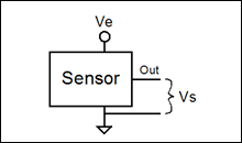 使用阻性元件的傳感器通常令一個電流流過電阻并測量其電壓。在輸出傳感器之前,可以將該電壓進行放大或電平偏移,但是其大小仍然與流過電阻的電流相關。如果該電流來自于電源電壓,那么傳感器的輸出與電源電壓成比例。公式2描述了這類比例傳感器的輸出(圖1),其中Vs是輸出信號,Ve是激勵電壓,S是傳感器的靈敏度,P是所測參數的量值,C是傳感器的失調量。