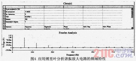 在頻域分析中就是以頻率作為分析的變量,分析信號中不同的頻率分量構(gòu)成。在頻率分析中,較為重要的概念就是電路的通頻帶與選擇性,作為諧振放大電路一方面要通過所需的頻率成分,因而對其具有通頻帶的要求,另一方面,要抑制不需要的信號的頻率成分,這種通過有效成分抑制無效成分的性質(zhì)稱為選擇性。但在實際應(yīng)用中往往要求通頻帶以內(nèi)傳輸系數(shù)盡可能大,通頻帶以外傳輸系數(shù)盡可能小,這樣信號失真小,抑制干擾能力強(qiáng),由此可見通頻帶與選擇性相矛盾,故用矩形系數(shù)K0.1說明。理想諧振放大器的頻率特性曲線,其矩形系數(shù)K0.1應(yīng)等于1,實際的諧振放大器的矩形系數(shù)總是大于1的。應(yīng)用軟件的傅里葉分析的頻譜圖如圖4所示。