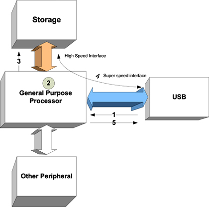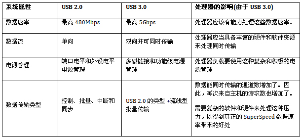 在一個(gè)普通的場景中,在device端,處理器直接連接到USB、存儲(chǔ)器和外設(shè)。記住這種結(jié)構(gòu),由High-Speed過渡到SuperSpeed,處理 器的影響可以概括如下: