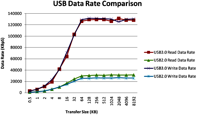 USB 2.0和USB 3.0的基本區(qū)別是帶寬。USB 2.0所提供的理論帶寬是480Mbps。事實(shí)上,收到的最大吞吐量約為320Mbps (40MBps),它大致是理論值的三分之二。使用USB3.0,數(shù)據(jù)吞吐量為4.8Gbps。如果我們用相同的比例,那么預(yù)期的數(shù)據(jù)速率是 3.2Gbps (400MBps)。然而,許多開發(fā)人員希望能提供更高的吞吐量。圖1顯示了USB 3.0 和USB 2.0用于Buffalo外部存儲(chǔ)磁盤進(jìn)行不同大小文件傳輸?shù)臄?shù)據(jù)率差異。應(yīng)該指出的是,USB 3.0數(shù)據(jù)速率受儲(chǔ)存設(shè)備約束,否則400 Mbps的數(shù)據(jù)速率很容易達(dá)到。