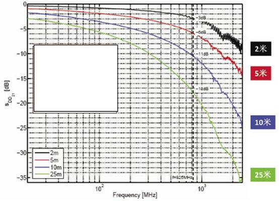 眾所周知,超高頻音視頻信號傳輸時最大問題是信號的過度衰減。信號頻率越高,傳輸距離越長,衰減幅度呈指數(shù)急劇下降。圖2是HDMI線纜中輸入信號衰減隨信號頻率變化的曲線圖。
