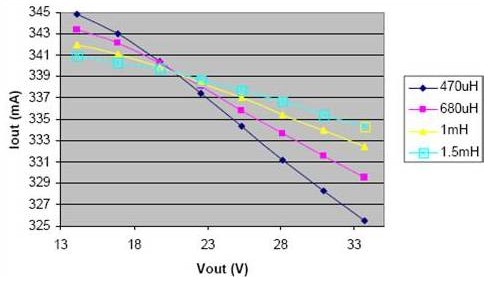 上圖是不同電感值下的頻率響應(yīng)。下圖說(shuō)明了電感減小時(shí),在輸入電壓的變化范圍內(nèi),負(fù)載電流的變化明顯增大。