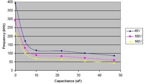 首先,我們來(lái)看一下電感的影響,假設(shè)沒(méi)有輸出電容(COUT)的存在,這樣負(fù)載電流和電感電流完全一致,能更清楚地說(shuō)明電感的影響。下圖給出了在輸入電壓的變化范圍內(nèi),電感值對(duì)頻率的影響。可以看出,輸入電壓對(duì)頻率的影響很大,電感值在輸入低電壓時(shí)對(duì)降低頻率有很大影響。(注:不一定是和參考圖完全一樣,在此只是說(shuō)明問(wèn)題)