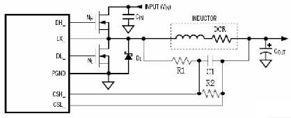 由于輸出電壓低,那么電流比較器的兩個輸入管腳的共模電壓較低,因此可以使用低輸入共模電壓的差動放大器,提高電流檢測的精度,降低噪聲。這種配置另一個大的優(yōu)點是可以使用電感的DCR作為電流檢測電阻。要注意的是,在電感值和飽和電流滿足整個輸入電壓范圍和輸出負載電流范圍的前提下,對電感的DCR有一定的限制,因而在一些應用中需要定制電感。此外,電流比較器的輸入阻抗要大,兩個輸入管腳的偏置電流要小,從而提高使用DCR作為電流檢測電阻時的檢測精度。相關(guān)的濾波元件也在設(shè)計作相應的匹配,如下圖所示。