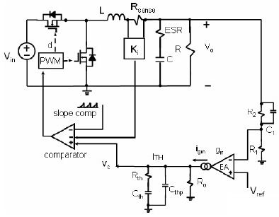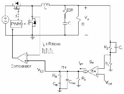 前面的討論知道:在每個開關(guān)周期,續(xù)流回路即低端的開關(guān)管流過的電流波形為下降階段的梯形狀波形。對于這種電流模式常稱為谷點電流模式。和峰值電流模式一樣,谷點電流模式反饋也有二個環(huán)路:一個電壓外環(huán),另一個是電流的內(nèi)環(huán)。其工作原理如下:高端的主開關(guān)管開通,電感激磁,電流線性上升;高端 MOSFET的導通一段固定的時間,此時間由 PWM 設(shè)定。當高端 MOSFET 關(guān)斷后,低端MOSFET 導通,此時電感開始去磁,電流線性下降。注意到低端 MOSFET 的電流隨著時間線性下降,電流檢測電阻的電壓信號也線性下降,由于此時電壓外環(huán)的輸出電壓信號低于電流檢測電阻的電壓,電流比較器輸出為低電平。當電流檢測電阻的電壓信號繼續(xù)下降,直到等于電壓外環(huán)的輸出電壓信號時,電流比較器的輸出翻轉(zhuǎn),從低高電平翻轉(zhuǎn)為高電壓,邏輯控制電路工作,關(guān)斷低端的續(xù)流開關(guān)管的驅(qū)動信號,高端的主開關(guān)管開通,此時電感開始激磁,電流線性上升,進入下一個周期,如此反復。