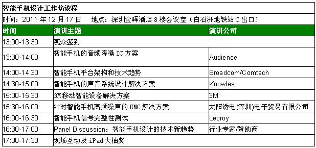 HTC、SAMSUNG、LG、SHARP、AT&T、SK Telecom、PANTECH、DoCoMo 等手機設計領軍廠商在智能市場領域的競爭非常激烈,他們都用到哪些技術?由我愛方案網(www.52solution.com)、電子元件技術網(www.tzzsdz.com)和China Outlook Consulting主辦的首屆智能手機設計工作坊(Smart Phone Design Workshop)將于2011年12月17日下午在深圳金暉酒店8樓會議室隆重召開!為您Hold 住 2012 智能趨勢,給力手機開發設計!