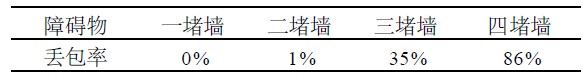 ②數據傳輸距離為30 m時,隨著障礙物增加而產生的丟包率;實驗數據分別如表1、表2所示。