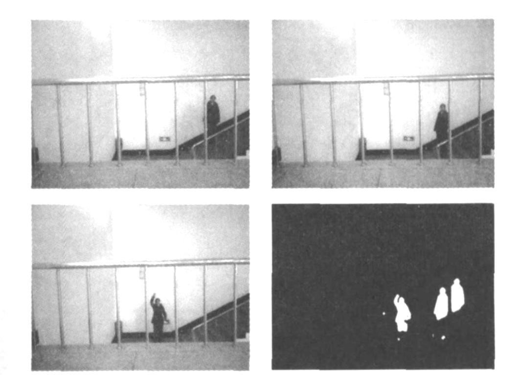 本系統采用運動目標檢測算法,實現對監視對象的圖像處理與異常判斷,占背景面積8‰的小目標都能被系統識別。系統有效消除了因環境光線變化、背景微變、小目標漸進運動等因素引起的系統誤判。采用本系統軟、硬件進行入侵事件檢測,其實驗圖片及檢測效果如圖5所示。