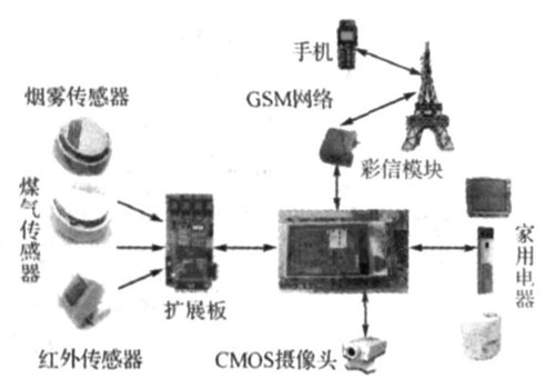 本系統采用模塊化設計方案。以嵌入式系統主板為核心,通過CMOS攝像頭對關鍵部位進行安全監測,通過手機傳遞安全信息和圖像彩信,并對家用電器進行遠程控制,利用ZigBee模塊實現家用電器、系統主板和煙霧、溫度、煤氣等傳感器的無線聯網。