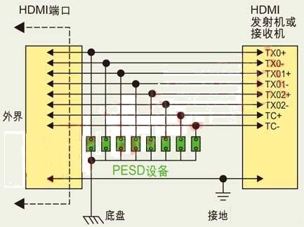 圖中展示了PESD器件對(duì)HDMI接口電路進(jìn)行保護(hù)的典型應(yīng)用圖。