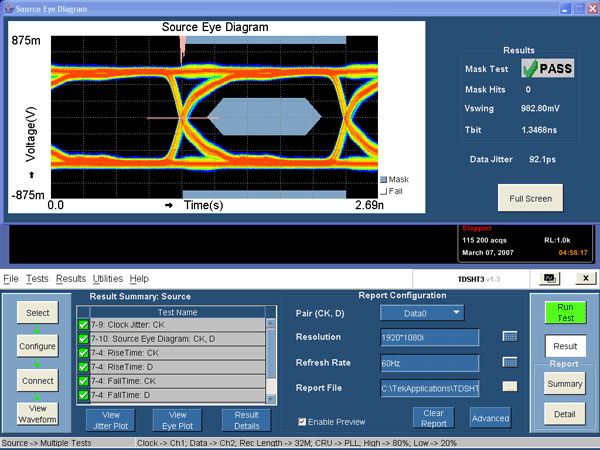 圖2是一次利用HDMI一致性測試軟件進行HDMI V1.3源端測試得到的結果。同時,為保證全面體現信號特點,CTS 1.3b還規定了捕捉信號所需的最小示波器記錄長度。根據該規定,示波器至少應能累積40萬個單位時間間隔(或Tbit)來繪制眼圖。在16 M/20 M的記錄長度下,示波器至少能捕捉40萬單位時間間隔的低分辨率信號,或260萬單位時間間隔的高分辨率信號。考慮到高達3.4Gbps的數據率,高采樣率(高于10GS/s)下示波器的最小記錄長度就應大于16M。