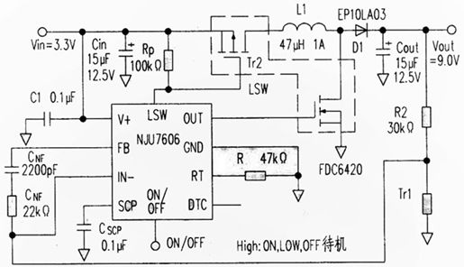 最近廠家生產(chǎn)出了帶負(fù)載切斷功能的升壓型變換器IC,使用時(shí)采用圖1所示的電路。在待機(jī)時(shí)借助于P溝道MOSFET Tr2的截止,切斷輸入端和輸出端的直流通路。