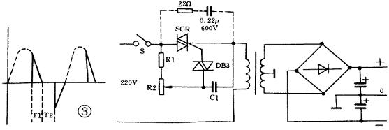 圖3是某電子雜志刊出的無級直流輸出調壓電路。原作者稱,利用Rc移相網路控制SCR的導通角改變變壓器初級的電流,從而獲得兩路連續可調的2x(0—17V) 的直流輸出電壓,負載電流為800mA 。很明顯,推薦電路(圖3)是普通移相式調功電路和降壓變壓器整流濾波電路的串聯, 從基本原理分析,似乎無大的原則問題。變壓器初級每半周電流有效值隨可控硅導通角變化,次級輸出電壓的峰值、平均電流值都隨之而變。當然,一定負載時輸出整流電壓也必然改變。本人看后,極感興趣,依此原理制作了一臺輸出100±40V范圍變化的維修代用直流電源,并依照圖中虛線加入RC吸收回路。實驗時,該電路一接入電源,距此10米遠的電視機屏幕上即出現兩條緩慢移動的黑帶(從鄰居的責問中得知),同時,空載下不到十分鐘,SCR即擊穿。更不能容忍的是,降壓變壓器鐵心發出拖拉機啟動時的聲音,室內電度表也發出同樣的聲音,而且,隨著輸出電壓的調低,聲音更大。