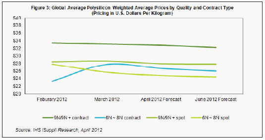 IHS iSuppli公司的多晶硅價格指數(shù)預示,未來幾個月,現(xiàn)貨市場和合同談判中的多晶硅價格都將下跌。但IHS iSuppli公司的研究顯示,多晶硅的價格可能發(fā)生變化,這不僅合同類型,而且取決于純度、供應商所在位置和合同條款。例如,6月份9N/9N+純度的多晶硅合約價格預計會從2月時的33.40美元降至32.20美元。同時,6月份9N/9N+純度的多晶硅現(xiàn)貨價格預計從2月時的27.90美元降到24.40美元,如圖2所示。[member]
