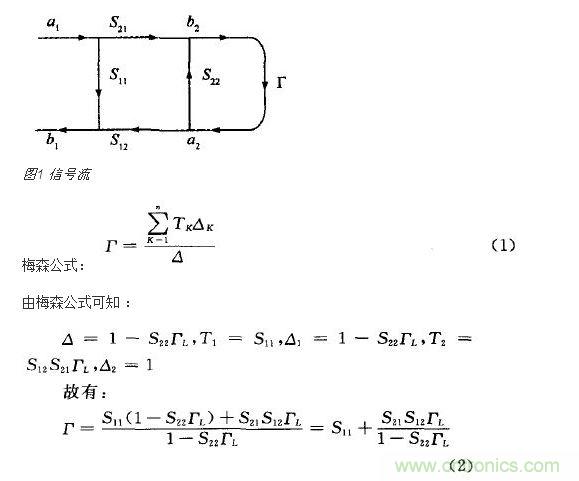 信號流圖(如圖1所示)結合散射參數是分析微波網絡和微波測量系統的簡便有效方法。流圖公式亦稱梅森不接觸環法則(Mason’s non-touching loop rule),簡稱梅森公式。根據梅森公式可以直接求出信號流圖中任意兩點之間的傳輸值。