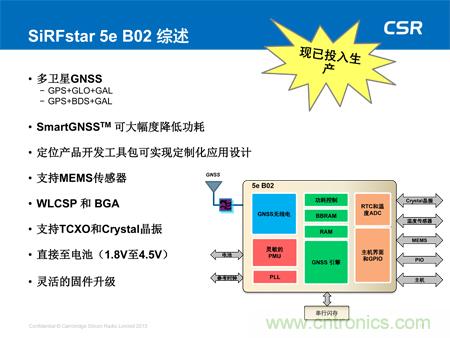 SiRFstar 5e B02可用于資產跟蹤及可穿戴設備應用。該低功耗器件現已全面投入生產,不僅可大幅度降低功耗且不影響定位精度,還可提供多衛星GNSS支持,可滿足所有地區對GNSS的需求,包括美國的GPS、歐洲的伽利略、俄國的Glonass及中國的北斗衛星系統。此外,SiRFstar 5e B02還搭載了CSR全新的SmartGNSS技術,可提供兩種模式最大程度地降低功耗,并能夠根據信號條件及衛星可用性自主管理GNSS系統的應用。