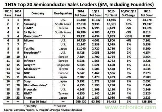 IC Insights的2015上半年全球前二十大半導體供貨商排行榜(包含晶圓代工業者)