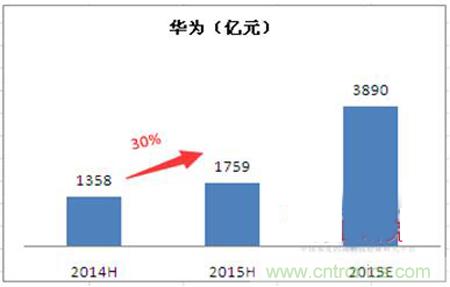 華為2015年上半年實現銷售收入1759億人民幣,較上一年同期的1358億人民幣增長30%,營業利潤率18%。而在最近迪拜舉行的華為網絡峰會上,華為表示預計2015年全球營收增長超過29%,達到600億美元以上。華為去年的總營收為465億美元。