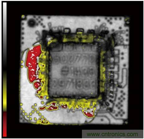 圖2. 過度加熱引起PBGA器件的基板和塑封材料之間分層(通過掃描聲學顯微鏡觀測)